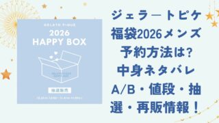 福袋 ジェラ-トピケ福袋2026メンズ予約方法は?中身ネタバレA/B・値段・抽選・再販情報! ジェラピケ福袋2026の情報が解禁されましたね!予約開始日サイト名送料予約:2025年10⽉31⽇(金) 12:00〜1... 2025.09.06 福袋